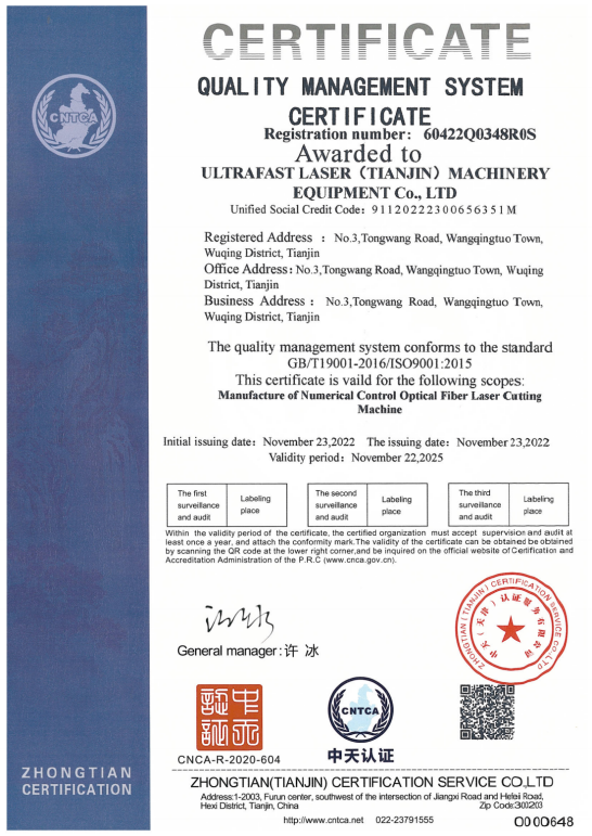 超快激光擁有一支專業(yè)從事激光切割設(shè)備研發(fā)設(shè)計(jì)的強(qiáng)大技術(shù)團(tuán)隊(duì),獲得多項(xiàng)實(shí)用型設(shè)計(jì)專利,已通過(guò)ISO9001質(zhì)量管理體系認(rèn)證證書,并且獲得國(guó)家頒發(fā)的高新技術(shù)企業(yè)證書。